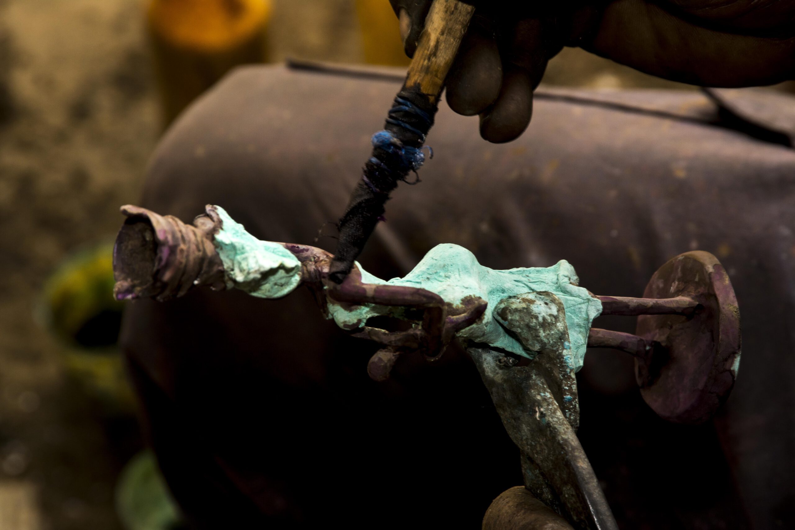 Anschließend werden die rohen Bronzefiguren noch geschliffen, poliert oder Farbig gemacht. Beim einfärben werden die Figuren angemalt, um jedoch eine nachhaltige Patina zu erhalten werden sie später erneut mit Feuer bearbeitet.